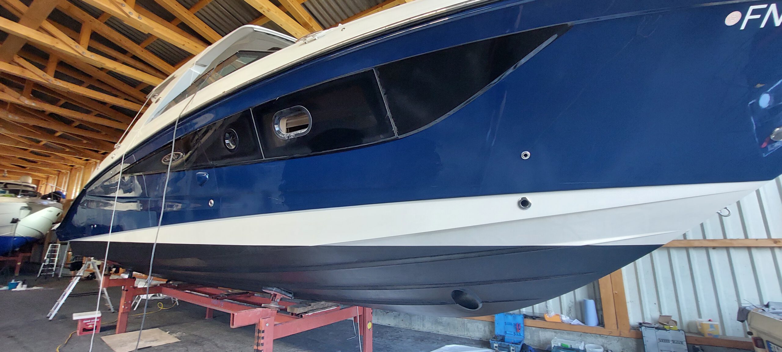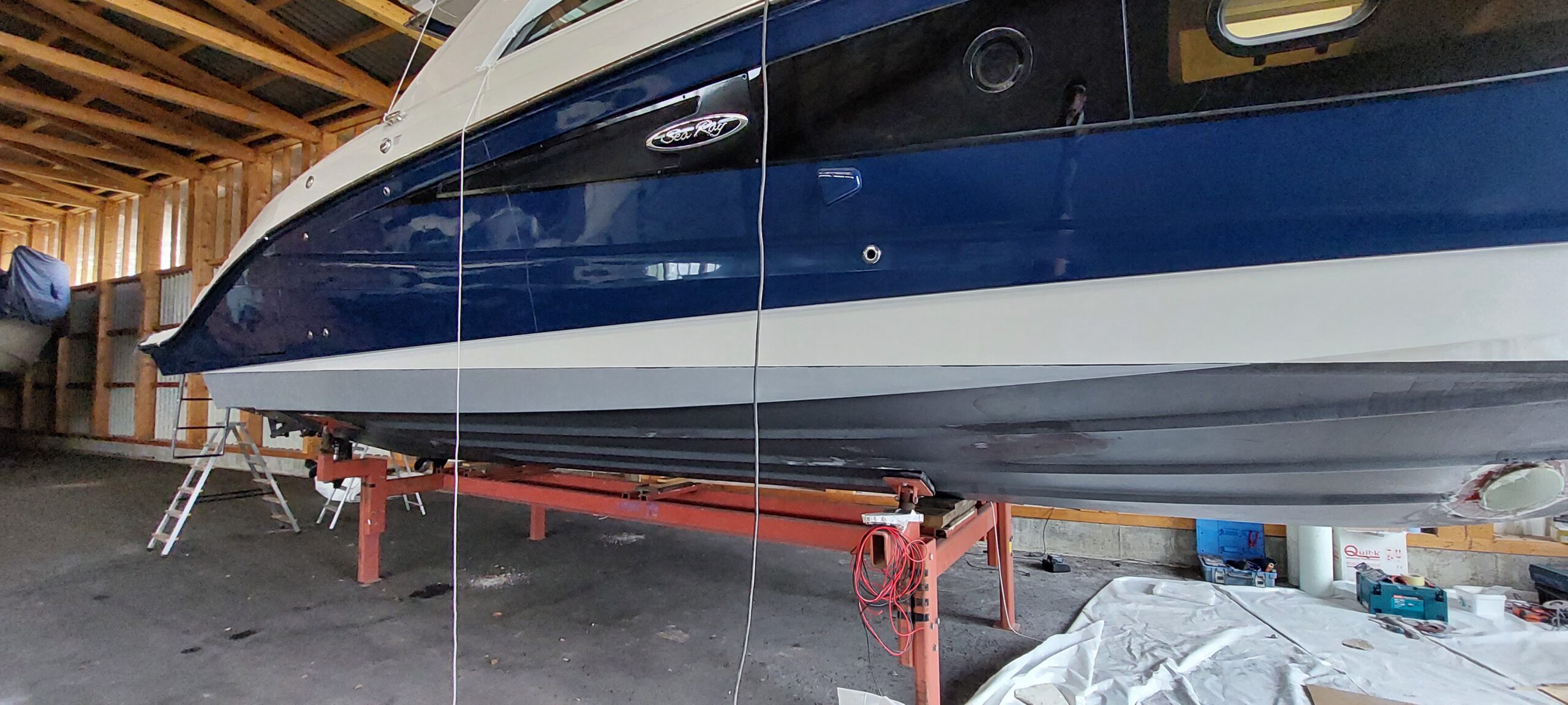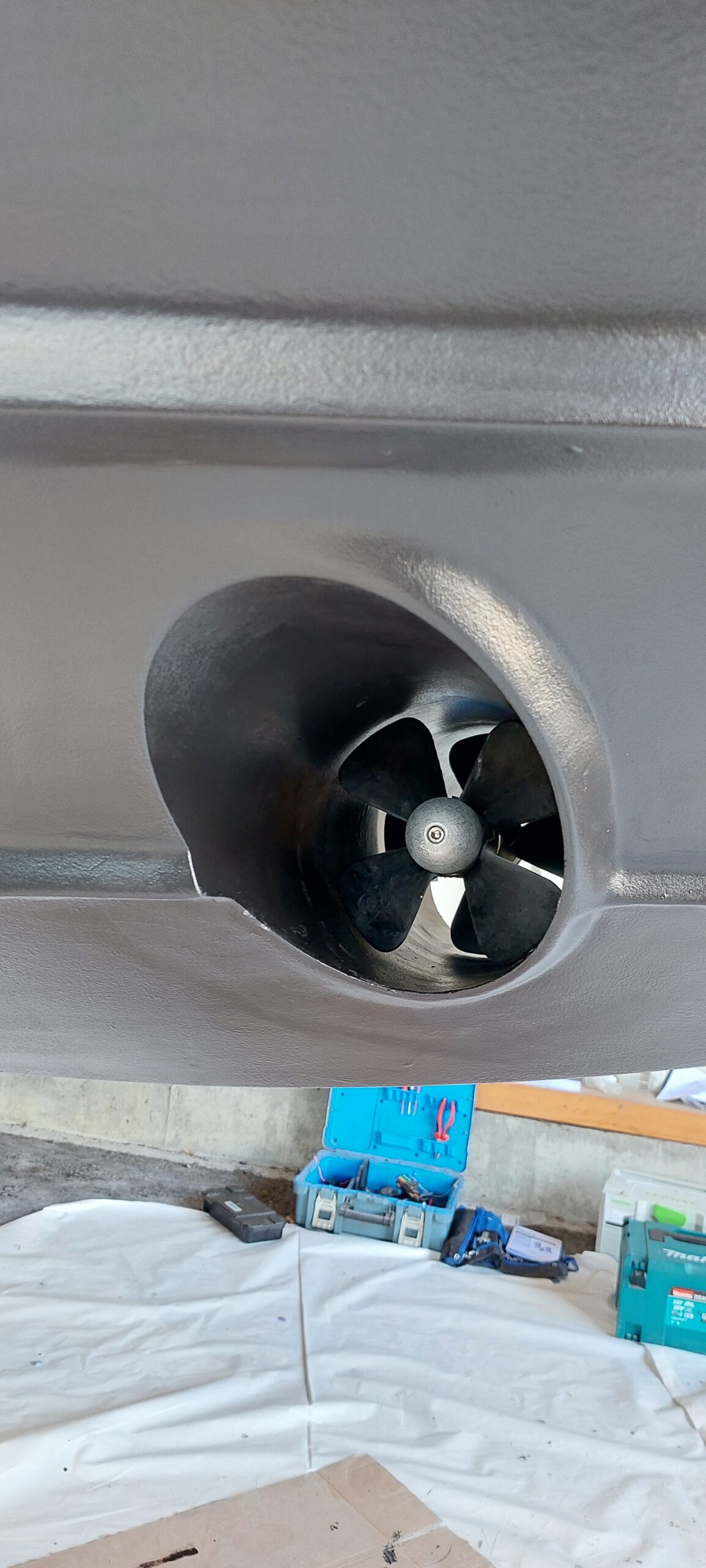 Auf Kundenwunsch wurde bei einer SEARAY 400 SLX ein Bugstrahlruder nachgerüstet. Der Einbau gestaltete sich nicht leicht, für uns aber kein Problem. Verbaut wurde ein Bugstrahlruder von Quick mit 6,5KW, zwei 105Ah Batterien mit extra Ladegerät, Joystick plus Funkfernbedienung auch für die Ankerwinde. Im gleichen Zug wurde das Unterwasserschiff mit aufgefrischt. Wir legen großen Wert darauf unsere Bugstrahlruder sehr stark zu verlaminieren, um die Stabilität im Rumpf zu erhalten. Außerdem empfehlen und verbauen wir immer die größt möglichste Größe und Leistung für das jeweilige Boot, um beim Anlegen die beste Leistung für unsere Kunden zu erzielen.