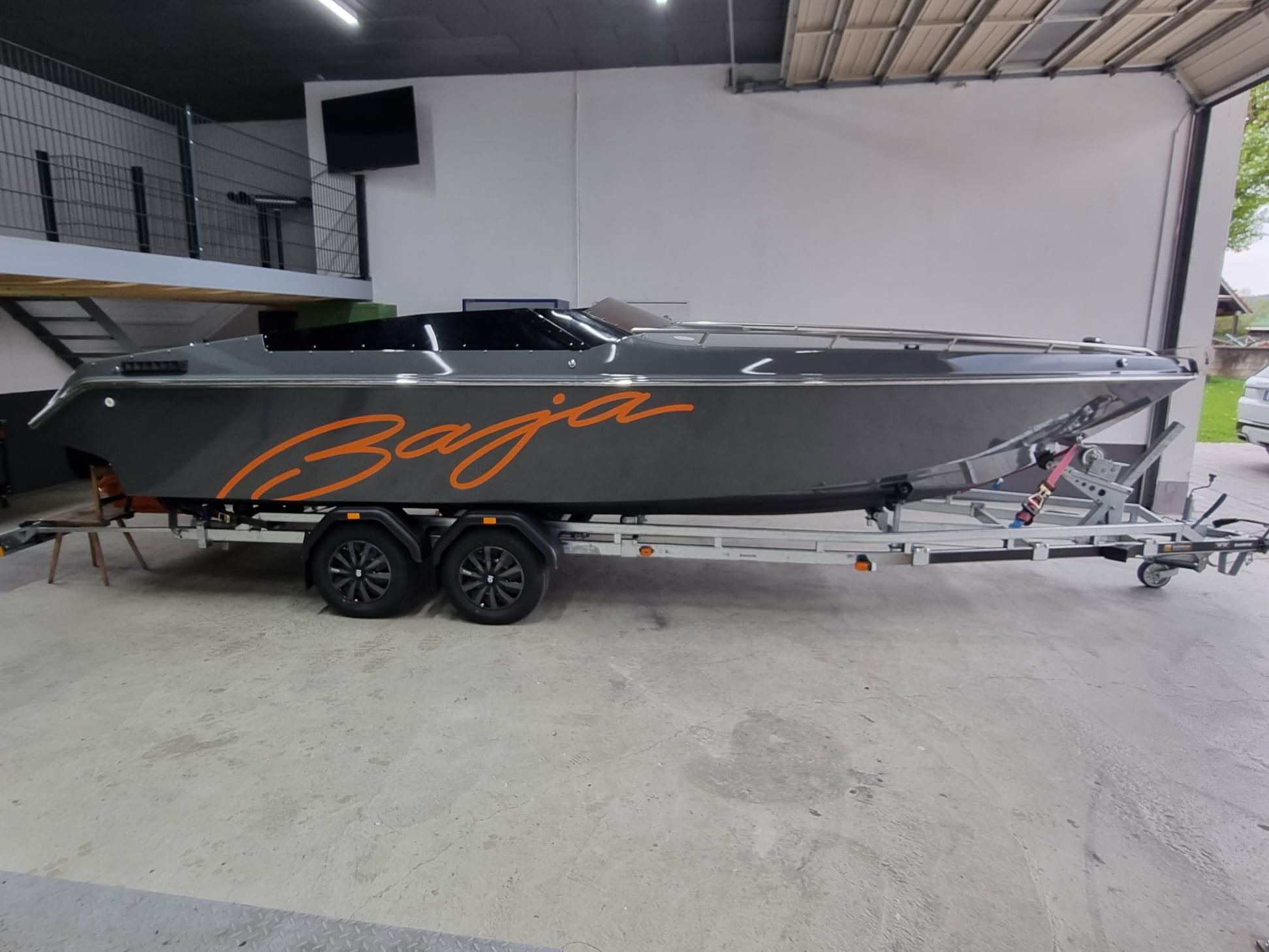 Bei dieser BAJA wurde der Motor ausgebaut und entrostet. Es wurde ein kompletter Service an Motor und Antrieb durchgeführt und neue Edelstahlkrümmer von HITEC montiert. Leider haben wir festellen müssen das die Transomplatte defekt ist und haben daher eine neue verbaut. Denn Sicherheit geht auf dem Wasser vor! Im gleichen Zug haben wir den Motorraum wieder auf Vordermann gebracht. Das Boot bekam noch einen neuen Anhänger der auf das Boot komplett neu eingestellt wurde. Nach unserer Reparatur und den Umbauten bekam die BAJA noch eine neue Folierung durch die Firma Pstylesgermany verpasst. Schönes Projekt! Jetzt kann die Saison voll los gehen!